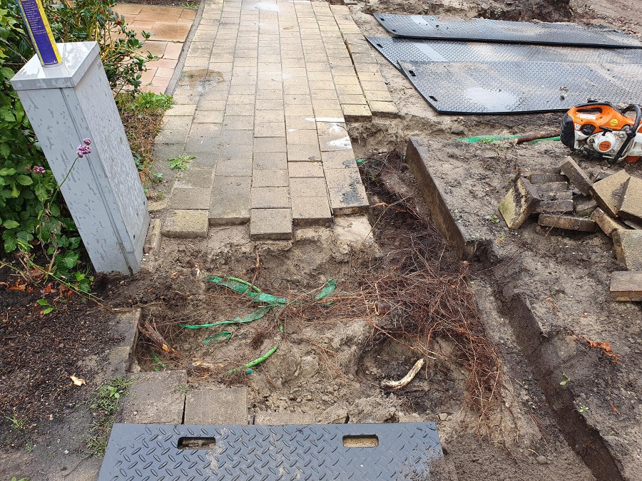 Ondergrondse werkzaamheden in de buurt van boomwortels zorgen nog wel eens voor lastige situaties bij aannemers of gemeentes. Regelmatig worden wij ingehuurd om tijdens de werkzaamheden inspecties uit te voeren en in samenspraak met de aannemer oplossingen te zoeken om toch het gewenste resultaat te behalen, zonder schade aan de bomen. Zo ook bij deze reconstructie van de Dorpstraat. Hier werd niet gegraven, maar is de grond tussen de wortels weg gezogen.